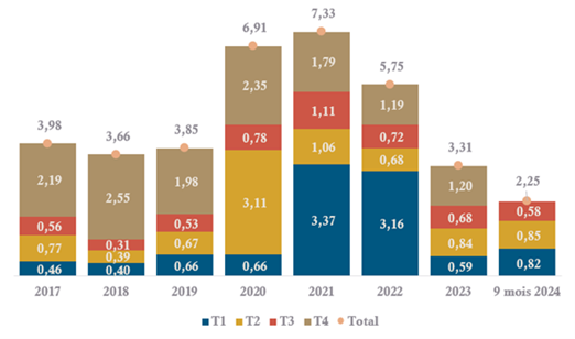 Le 3ème trimestre 2024 s’inscrit en hausse de 95 % par rapport au 3ème trimestre 2023 en atteignant 550 millions d’euros.
